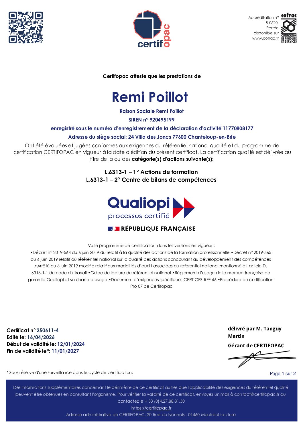 La certification Qualiopi a été délivrée à Rémi POILLOT au titre des catégories d’actions suivantes : Action de formation et Bilan de compétences.